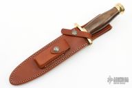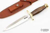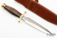 This Model 2-7 by Randall Made knives features a satin finished double edged blade, .194" blade thickness and 1.236" blade depth, hidden tang construction. The Model 2 is a heavily made dagger or dirk. Has a brass forward curved guard and flanged butt, walnut grip with black spacers. Comes with a brown leather sheath and Randall zippered case. Excellent condition.