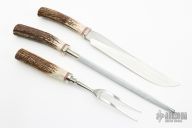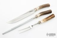 "Designed to meet every requirement as the ideal table knife, it is rustproof and will resist staining as ordinary blades do when used in carving meat. Complete with high-quality stag handled Sharpening Steel and Fork. A three-compartment felt case is included. " Satin finished blade with .174" blade stock and 1.228" blade depth, hidden tang construction. Nickel silver guards with stag grips and red/white/blue spacers. Comes with cloth rollup, and original papers. Excellent condition. NOTE: The carving set should not be placed in a dishwasher.