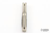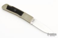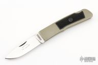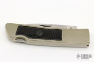 This Loveless Design lockback by Gerber Knives has a polished drop point blade with a nail nick. Has "Design by R.W. Loveless" etched on the blade.  The handle has a nickel silver frame with rubber inserts.  Light scuffs/scratches are visible otherwise the knife is in good condition.