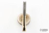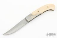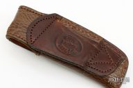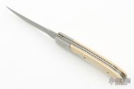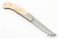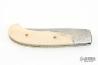 This Bolster Release Linerlock Auto by Jason Williams features a Damascus blade with false top edge and fileworked spine. The handle has Damascus bolsters with gold and silver inlaid engraving done by "JRS 02", gold plated screws, mammoth ivory scales, anodized and fileworked titanium liners, fileworked stainless steel backspacer. #133 inside backspacer. Nice action and blade seating, has blade play, has a hair trigger, some scratches and light patina, otherwise good condition. Comes with a brown leather belt sheath.