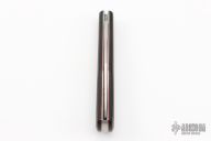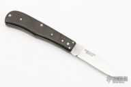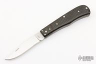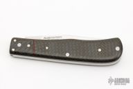 This Trapper slipjoint by Alan Harvey features a hand rub satin finished blade with a nail nick. The handle has carbon fiber bolsters and covers with a red spacer and liners, stainless steel liners and spring. Has half-stop, flush in the open and closed positions. Has scratches, otherwise good user condition.
