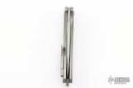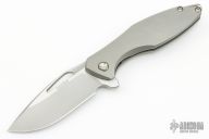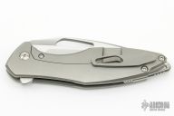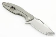 This Arius Flipper by Koenig knives features a burnished with PF blade with thumbhole and flipper. The handle has a bead blasted and C-pattern milled titanium frame satin titanium backspacer and a bead blasted tip up clip with hidden screws. Has ceramic bearings and a ceramic detent ball. Nice detent, lockup and blade seating. Comes with original box and COA dated September 5, 2022. Has a couple light scuffs, otherwise excellent condition.