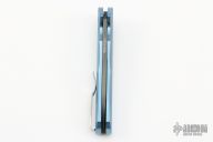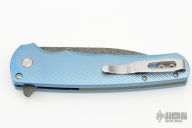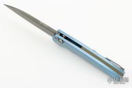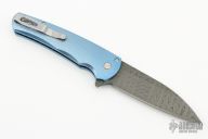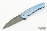 This Malibu by Pro-Tech features a Chad Nichols Damascus blade with flipper. The handle has a milled and anodized titanium frame with mother of pearl inlaid push button, green G-10 backspacer and a stainless steel tip up clip. Comes with original box and papers. Excellent condition.