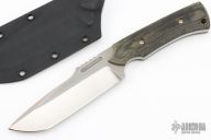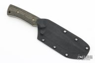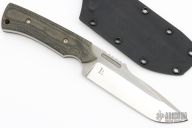 This TUSK by Paul Letourneau features a satin finished blade with raw bar flats, notched thumbrest and fullers, .215" blade stock and 1.488" blade depth, full tang construction. The handle has black canvas micarta scales with a lanyard hole. Comes with kydex sheath and a zippered case. Has some light scratches, excellent condition otherwise.