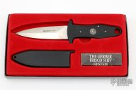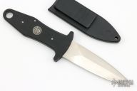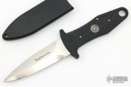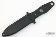 This knife is a Blackie Collins Design. Features a satin finished double-edged blade with .174" blade stock and 1.121" blade depth, hidden tang construction with black FRN handle. Comes with original sheath and the original box which is rare, also comes with a black plastic sheath.  The original box is damaged. however, the knife is in Excellent condition.