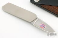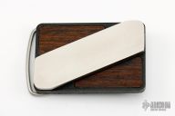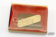 This Touché Belt Buckle Knife by Gerber features wood inserts on a plastic buckle the features a knife with stainless steel handle. Has scuffs and scratches, otherwise good condition. Includes the original box.