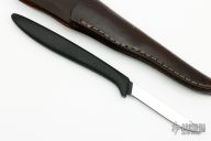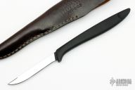 This bird and trout by Gerber features a mairror polished blade with a sharpened top edge and a hidden tang construction.  .045" blade stock and .401" blade depth. The handle has a cast aluminum grip. Comes with a brown leather sheath. Has some scratches, otherwise excellent condition.