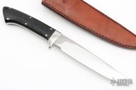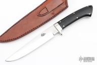 This Baltika from Citadel Knives features a mirror polished drop point blade with .150" blade depth and 1.110" blade depth. The handle is comprised of a stainless steel guard and black G-10 scales over full tang construction. Includes a brown leather sheath with belt loop. Excellent condition.