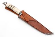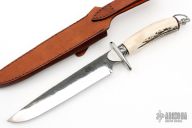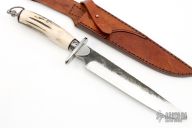 This Fighter from Citadel Knives features a mirror polished drop point blade with forge finished flats and fileworked spine, .197" blade depth and 1.335" blade depth, hidden tang construction. The handle has a stainless steel guard and engraved collar, stag grip with leather spacers, stainless steel butt with lanyard bail. Includes a brown leather sheath with belt loop. Excellent condition.