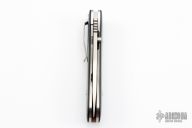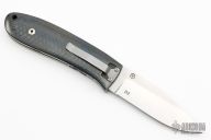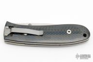 This DK-FHL linerlock folder by Dozier Knives has a satin finished D2 stainless steel drop point D2 blade with notched thumbrest and single thumb stud. Handle is has black/blue carbon fiber scales, titanium liners, titanium tip down clip, cocobolo backspacer. Excellent condition. Dated 2007.