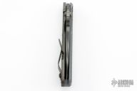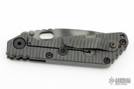 This SNG GG by Strider has a tiger stripped spear point blade with dual thumb studs, thumbhole, and notched thumb rest. Handle is gray G-10 and tiger stripe titanium frame, with lockbar stabilizer and a matching titanium tip up clip. Nice detent, lockup and blade seating.  Excellent Condition.