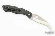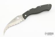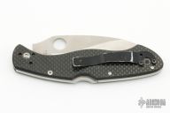 This Civilian Lockback Folder by Spyderco has a satin finished, fully serrated ATS-55 hawkbill blade with thumb hole. Handle has carbon fiber scales with stainless steel (single) liner, stainless steel backspacer/ lock, and tip up/down 2-way reversible RH black stainless steel clip. Has some wear on the clip, otherwise excellent condition. Comes with Spyderco zippered case.