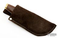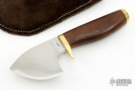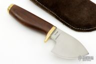 This Skinner by Sheldon Jones features satin polished drop point blade, .224" blade stock and 2.16" blade depth, hidden tang construction. The handle has a brass guard and butt with wood handle. Comes with a brown leather sheath. Has some light scratches, and some dings in the buttcap. Great condition otherwise.