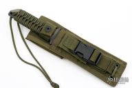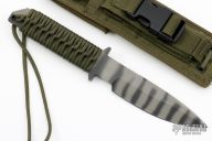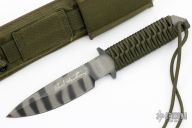 Special edition, Chuck Mawhinney "Sniper" fixed blade from Strider Knives. Chuck Mawhinney served in the Vietnam War and set a record number of confirmed kills for a USMC sniper. The CPM S30V blade has flat ground edge and sharpened top edge. The tiger striped blade is marked with a "Chuck Mawhinney" signature. The front tang is marked "STRIDER SNIPER" and the back has the logo. Full tang construction makes this knife very solid. Handle is paracord wrapped (green) and features jimping on the blade spine for thumb. Includes heavy duty SOE Brand Nylon sheath system with Kydex liner & accessory pouch. Has some light scuffs, otherwise excellent condition.
