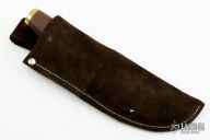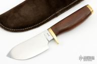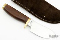 This Skinner by Sheldon Jones features satin polished upswept blade, .183" blade stock and 1.54" blade depth, hidden tang construction. The handle has a brass guard and butt with wood handle. Comes with a brown leather sheath. Has some light scratches, and patina. Great condition otherwise.
