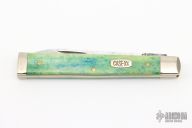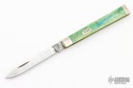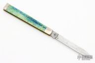 This Doctors Knife slip joint by Case Knives features a Damascus drop point blade with nail nick. The handle has nickel silver double bolsters, brass liners, giraffe bone covers, brass liners and stainless spring. Has a few light scratches, otherwise good condition.