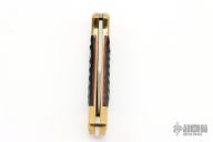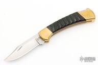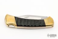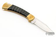 This Buck 112 features a satin finished clip point blade with nail nick. The handle has a brass frame with kudu jigged horn scales and a stainless steel backspacer. Comes with original black leather sheath. Has a few light scratches and patina, otherwise excellent condition.