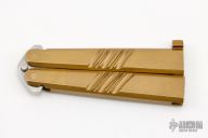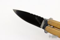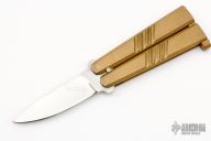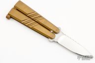 This Balisong features a mirror polished blade with a file worked blade spine. The handle features channeled brass frames and a brass t-latch. Includes a padded Velcro case. Excellent Condition.