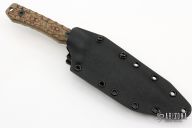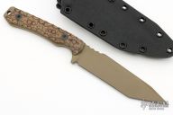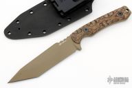 This Devestator Tanto by Frank Landau and Angryman Knives features an FDE cerakote tanto blade with a notched thumbrest, .223" blade stock and 1.258" blade depth, full tang construction. The handle textured camo canvas micarta scales with black screws. Comes with a kydex sheath with TekLok. New from maker!