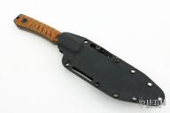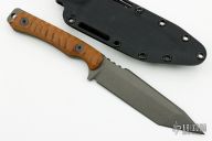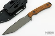 This Devestator Tanto by Frank Landau and Angryman Knives features an dark gray cerakote tanto blade with a notched thumbrest, .223" blade stock and 1.258" blade depth, full tang construction. The handle textured vintage paper micarta scales with black screws. Comes with a kydex sheath with TekLok. New from maker!