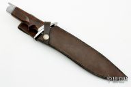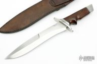 This Fighter by Steve Mullin has a hand forged and hand rub satin finished blade with sharpened top edge, .176" blade stock and 1.571" blade depth, hidden tang construction. The handle has a stainless steel guard and butt with black spacers, desert ironwood grip. Comes with a brown leather sheath. Has some light scratches, otherwise excellent condition. Comes with a zippered case.