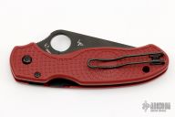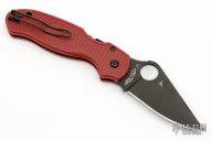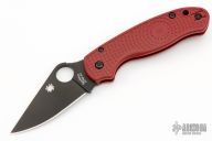 This Para 3 by Spyderco Knives features a black blade with a thumbhole and notched thumbrest. The handle features red FRN scales and a steel tip up pocket clip. Includes the original box and papers. Excellent Condition.