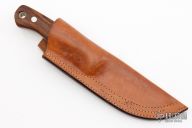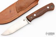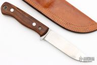 This Bushmaster by Daniel Koster features a tumble finished drop point blade with notched thumbrest, .207" blade stock and 1.135" blade depth, full tapered tang construction. The handle is comprised of ironwood scales with orange liners, lanyard tube. Includes a brown sheath. Excellent condition.