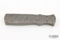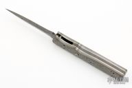 This Linerlock Auto by Burn Knives features a Damascus dagger style blade with false top edge, .155" stock. The handle has Damascus scales, titanium liners, Damascus backspacer. Has a couple light scuffs, otherwise excellent condition.