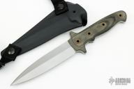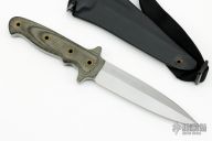This Vorpal 1-D by Tom Maringer features a bead blast finished blade with a 2" sharpened tip edge, full tang construction, .230" Blade Stock, 1.190" Blade Depth. The handle has black canvas micarta scales. Includes a kydex sheath with shoulder harness. Has a few light sheathing marks on the blade otherwise excellent condition.