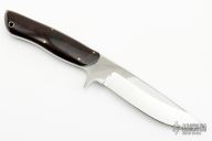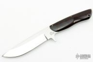 This Hunter by Jody Samson features a mirror finished blade with .187" blade thickness and 1.265" blade depth, full tang construction. The handle has maroon linen micarta scales with brass pins. Has a few light scratches, excellent condition.