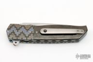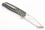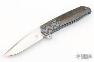 This Flipper by Andre Thorburn features a satin finished blade with notched thumbrest and flipper. IKBS System (Ikoma Korth Bearing System). The handle has stippled Zirconium bolsters, marbled carbon fiber scales, anodized and fileworked titanium liners, G-10 backspacer, tip up titanium clip. Nice detent, lockup, and blade seating. Comes with a zippered case and COA. Excellent condition.