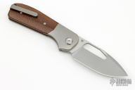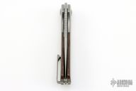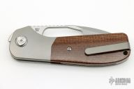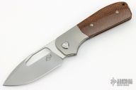 This Field Duty by Reate is a Liong Mah design, it features a satin finished blade with notched thumbrest and a thumb hole. The handle has a blasted titanium frame with brown burlap micarta scales, titanium backspacer and tip up clip, lanyard pin. Comes with original Velcro case and packaging. New Condition.  #28/125