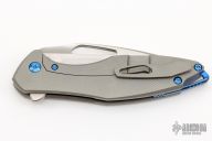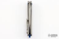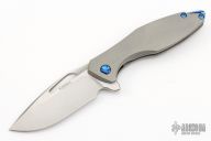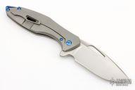 This Arius by Koenig knives features a stonewashed blade with satin flats, thumbhole and flipper. The handle has a bead blasted titanium frame with a titanium tip up clip, anodized titanium backspacer. Has ceramic bearings and a ceramic detent ball. Nice detent, lockup and blade seating. Comes with original box and March 15, 2023. Excellent condition.