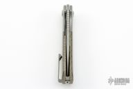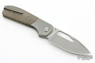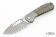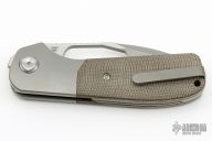 This Field Duty by Reate is a Liong Mah design, it features a satin finished blade with notched thumbrest and a thumb hole. The handle has a blasted titanium frame with brown canvas micarta scales, titanium backspacer and tip up clip, lanyard pin. Comes with original Velcro case and packaging. New Condition.  #066/125