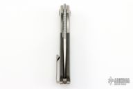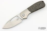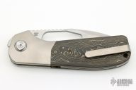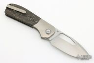 This Field Duty by Reate is a Liong Mah design, it features a hand rub satin finished blade with notched thumbrest and a thumb hole. The handle has a blasted titanium frame with camo gold carbon fiber scales, titanium backspacer and tip up clip, lanyard pin. Comes with original Velcro case and packaging. New Condition.  #085/125
