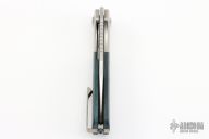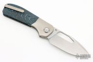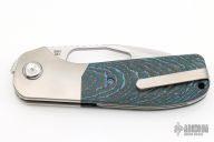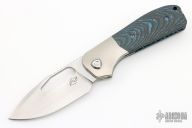 This Field Duty by Reate is a Liong Mah design, it features a hand rub satin finished blade with notched thumbrest and a thumb hole. The handle has a blasted titanium frame with Blue/black carbon fiber scales, titanium backspacer and tip up clip, lanyard pin. Comes with original Velcro case and packaging. New Condition.  #043/125