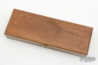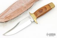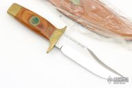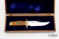 This fixed blade by Smith and Wesson features a wood handle with brass guard and butt cap. Mirror polished bowie style blade with 1/4" blade stock and 1 1/4" blade depth. Has "Texas Rangers 1823-1973" stamped on blade and a "Texas Rangers Commemorative Commission" inlay on handle. Excellent condition. Includes a wooden display box and original brown leather sheath.