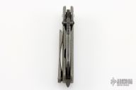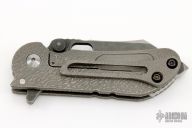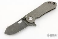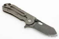 This Mini M8 Flipper by Direware Custom Knives features a dark tumble finished blade with swedge, notched thumbrest, and flipper. The handle has a hand textured and tumble finished titanium frame with a 440C hardened stainless steel pointed backspacer, textured and tumbled titanium tip up clip. Nice blade seating, detent and lock up, rides on bearings. New from maker.