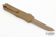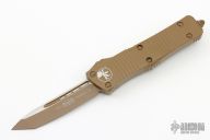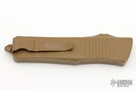 This Troodon OTF automatic features a Tan cerakoted tanto blade with a standard edge. Stainless steel clip. Glass breaker. Serial number 10133 and dated05/2022. Tan aluminum frame. Excellent condition.