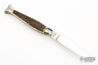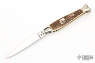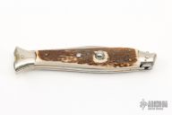 This Fish side opening automatic by AGA Campolin features a mirror polished clip point blade. The handle has nickel silver bolsters, front and rear, stag scales, brass liners, and a stainless steel backspacer. Has safety. Has a few light scratches, otherwise excellent condition.