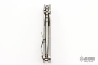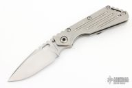 This Mick Strider Performance Series SMF framelock folder features a spear point blade with thumbhole and notched thumbrest. The handle has a stonewashed titanium frame with titanium clip, tip up carry. Jimping on blade spine. Includes Hinderer "Lock Bar Stabilizer" for maximum reverse lock retention. Nice detent, lockup and blade seating. Excellent condition.