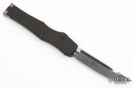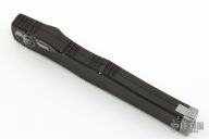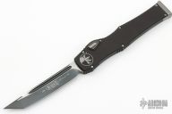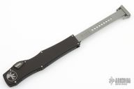 This Halo VI by Microtech knives features a black tanto blade with fullers and satin flats. The handle has a black aluminum frame with blasted stainless steel hardware and charging handle. Dated 05/2018 and s/n 969. Comes with original box and papers. Excellent Condition.
