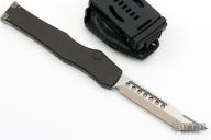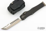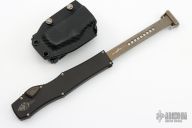 This Halo VI features a bronzed Hellhound tanto blade with satin flats, fullers and notched spine. Its handle is made from black Mil-Spec anodized alloy with bronzed hardware. The charging handle comes marked with the Microtech logo and date of creation along with the serial number. Microtech's Halo VI sets itself apart from previous models with added safety features and an improved charging handle mechanism. . Its upgraded charging handle is built with dual pivoting latches that create a secure seal in the closed position. Comes with original box, kydex sheath and papers. Dated 9/2018. Excellent condition.