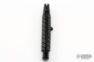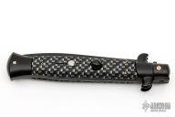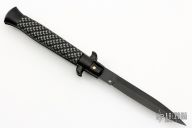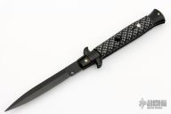 This 9" Picklock by Frank Beltrame features a black dagger ground blade with false top edge. The handle has black bolsters, front and rear, carbon fiber pattern acrylic scales, black liners and stainless steel spring. Excellent condition.