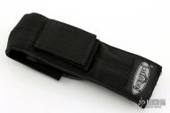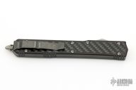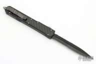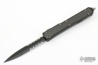 This Makora II OTF automatic features a black double edge partially serrated blade and carbon fiber inserts on both sides of the black aluminum handle. Dated 05/2009 with a S/N 02188. Comes with original box, papers and nylon sheath. Excellent condition.