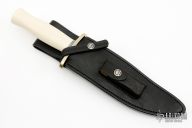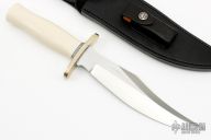 This Model 12-8 Bear Bowie from Randall Made Knives features a satin finished stainless steel blade with a sharpened top edge, .227" blade stock and 1.707" blade depth, hidden tang construction. The handle has a forward curved nickel silver guard, ivorite grip with black/duralumin spacers. Comes with a black leather sheath and zippered case. Excellent condition.