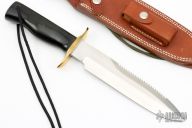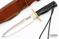 This Model 14 from Randall Made Knives features a satin finished spear point blade with sharpened top edge and sawteeth, .239" blade stock and 1.384" blade depth, full tang construction. The handle has a brass guard and black linen micarta border patrol style handle. Comes with brown leather sheath and a Randall zippered case. Excellent condition.