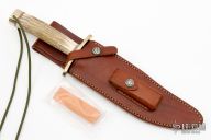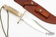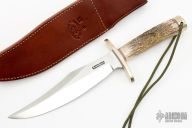 This Randall Model 12-8 Bear Bowie features a satin finish bowie style blade with sharpened top edge crafted from carbon steel, .194" blade stock and 1.655" blade depth, hidden tang construction. The handle is comprised of nickel silver guard and butt, red/white/blue spacers and a stag grip. Includes a brown leather sheath and a Randall zippered case. Has some light patina, otherwise excellent condition.