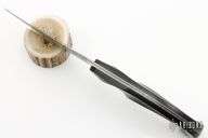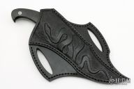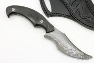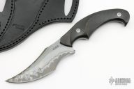 This Snake from the Sobral Brothers features their San Mai steel that has been forged into a beautiful finished product. Has a clip point recurve blade with a false top edge, .157" blade stock and 1.574" blade depth, full tapered tang construction. The handle features carbon fiber scales with stainless steel pins that have been laser engraved. Comes with a hand tooled black leather sheath and a leather zippered case. New from maker.