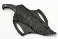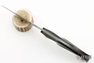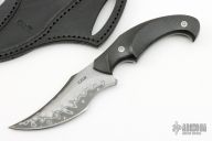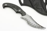 This Snake from the Sobral Brothers features their San Mai steel that has been forged into a beautiful finished product. Has a clip point recurve blade with a false top edge, .157" blade stock and 1.574" blade depth, full tapered tang construction. The handle features carbon fiber scales with stainless steel pins that have been laser engraved. Comes with a hand tooled black leather sheath and a leather zippered case. New from maker.